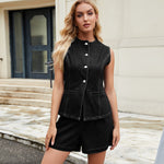 This sleeveless summer co-ord set delivers a fresh and modern look designed for warm-weather styling. With its structured top and relaxed shorts, it is ideal for casual city walks, weekend outings, or everyday summer wear that feels polished yet effortless. The clean shape and balanced proportions make it easy to style while maintaining a confident seasonal look.